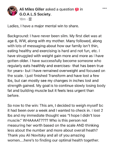 “Before I began working with Ali, I was obsessed with macro counting to the point it controlled my life. I wanted to find a way to sustain my level of health and fitness without feeling like I had to measure every morsel that went in my mouth. Since working with Ali, I have broken up with my kitchen scale and fitness tracker and it feels so freeing. To be able to listen to and trust my body is amazing.”
